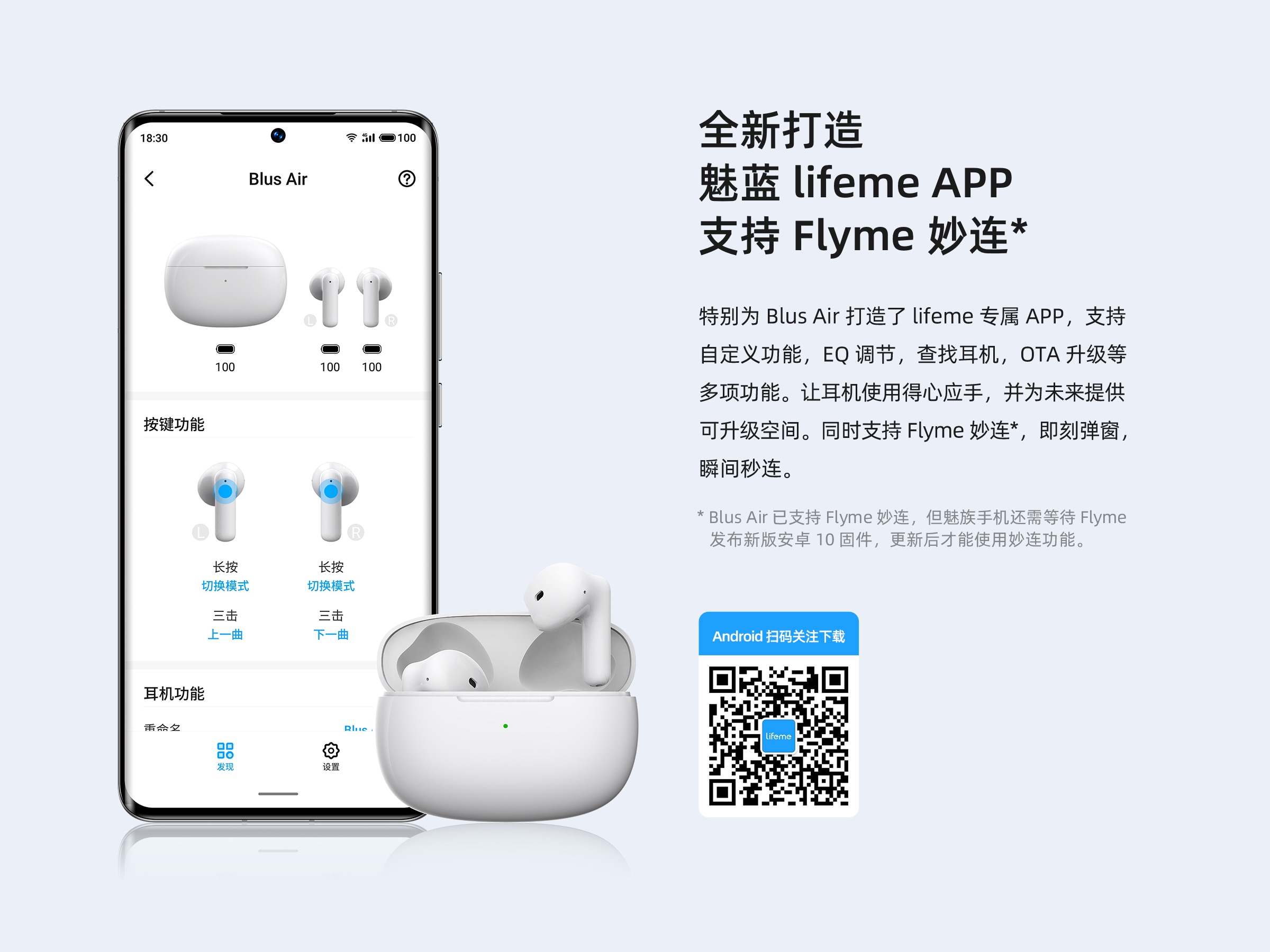 半入耳设计 IPX5 防水 | 专属 APP + flyme 妙连